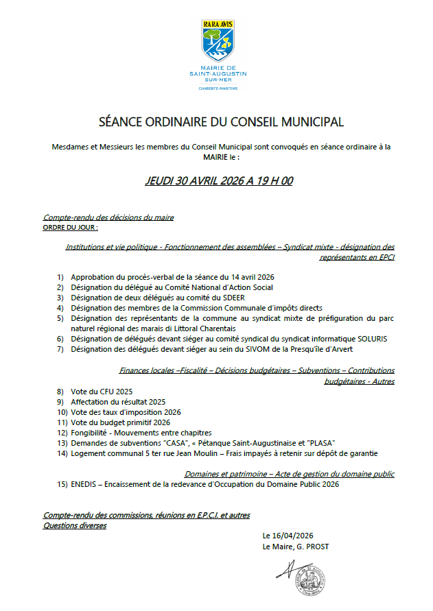 CONSEIL MUNICIPAL 30 AVRIL 2026 - Saint Augustin